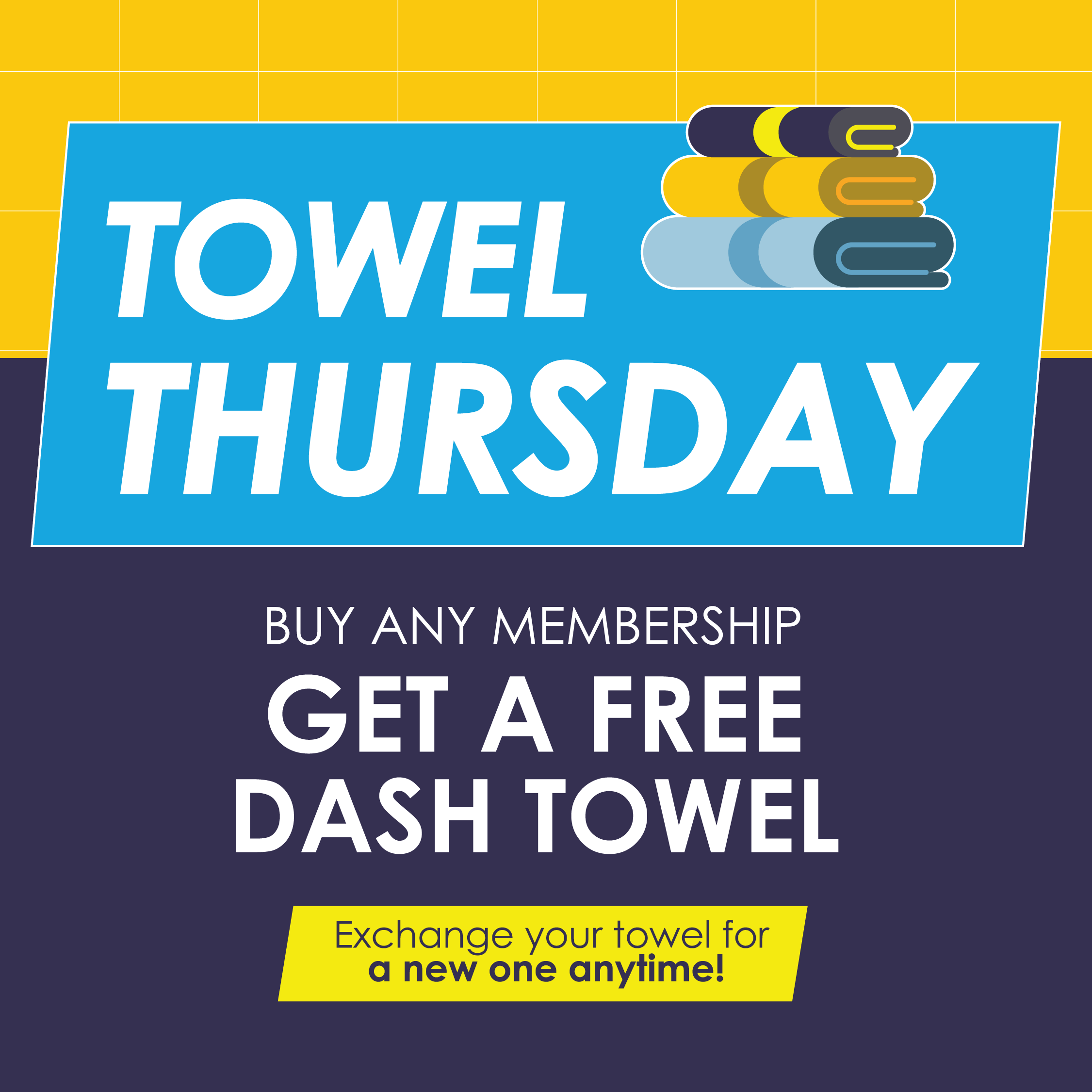 With Towel Thursday, when you purchase any membership, you’ll receive a free dash towel. And the best part? You never have to worry about washing it.