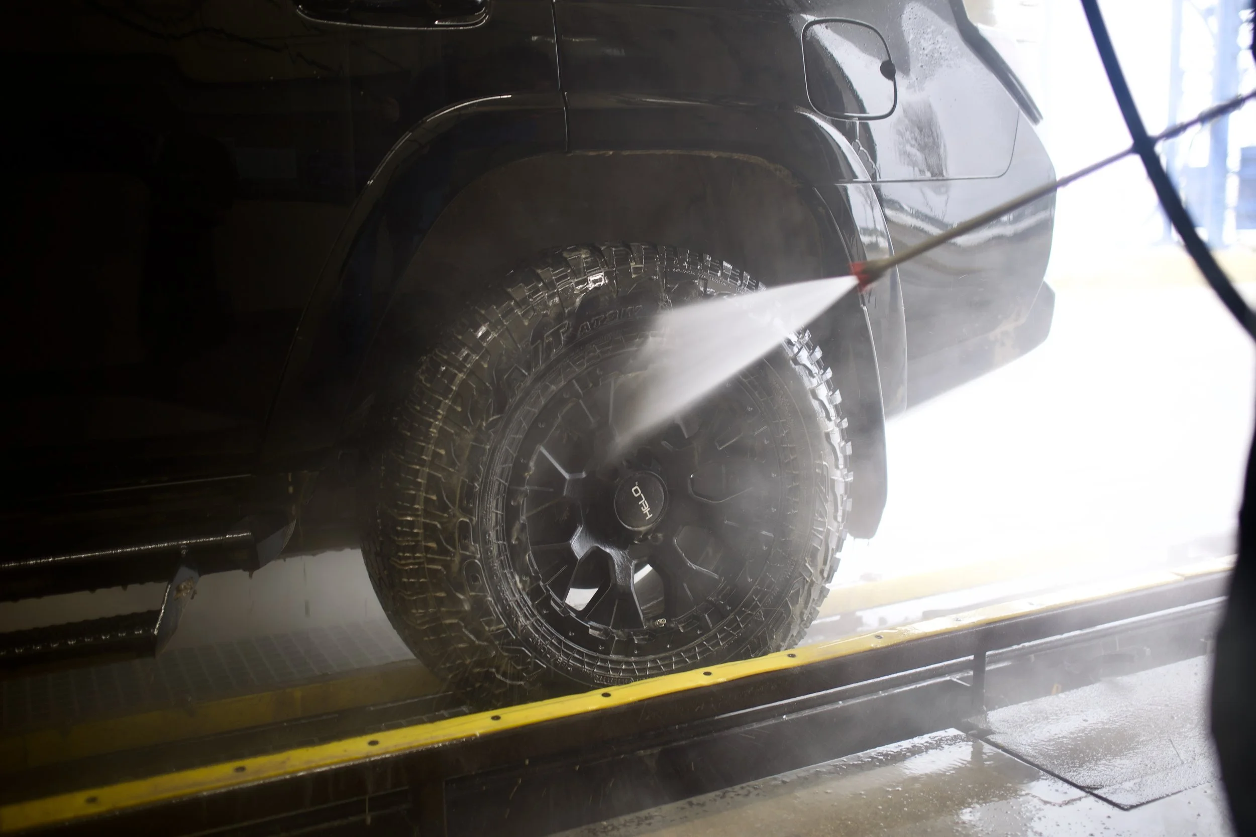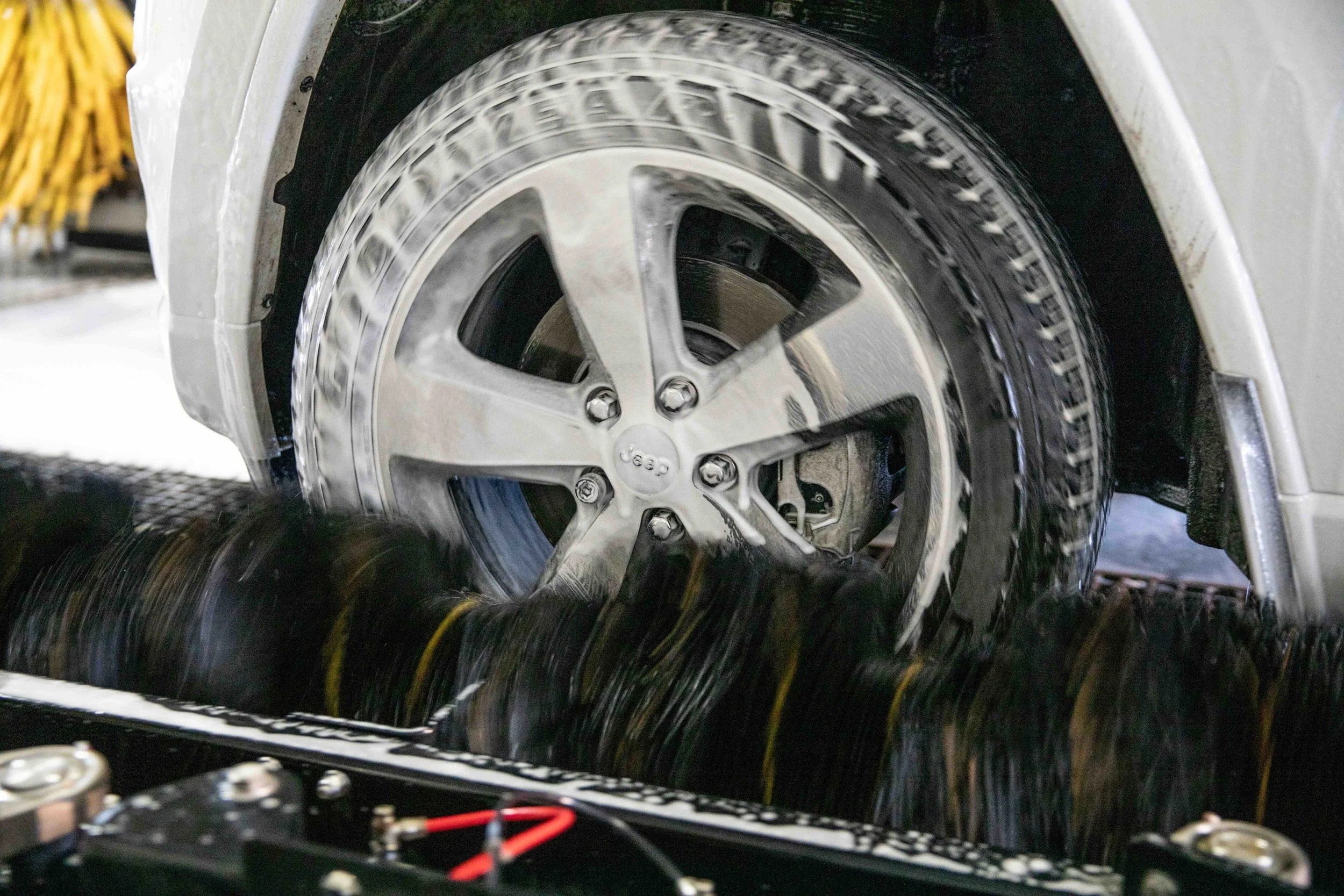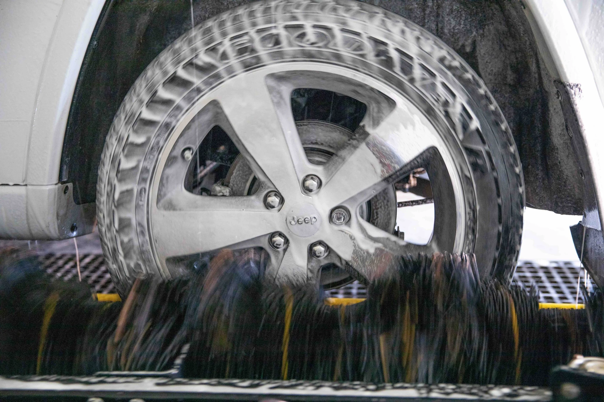 Then your vehicle goes through the wash. Only after the tire is fully cleaned and washed do we apply the shine.